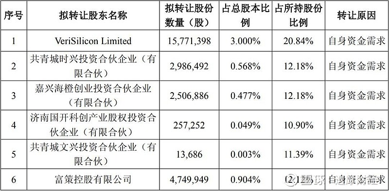 据芯原股份公告,此次询价转让的转让方包括VeriSilicon Limited、共青城时兴投资、嘉兴海橙创投、济南国开科创、共青城文兴投资、富策控股等六位股东。