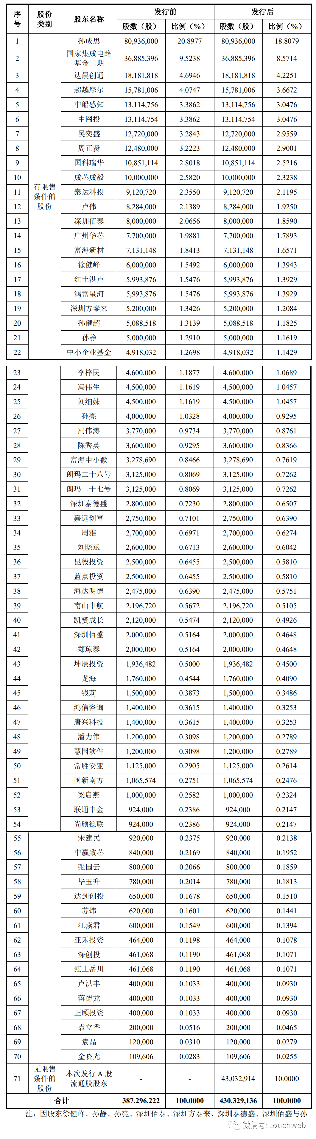 IPO后,孙成思直接持股18.8079%,国家集成电路基金二期持股为8.5714%,达晨创通持股为4.2251%,超越摩尔持股为3.6672%,中船感知、中网投分别持股为3.0476%,吴奕盛持股为2.9559%,周正贤持股为2.9001%,国科瑞华持股2.5216%,成芯成毅持股2.3238%,泰达科投持股为2.1195%,卢伟持股为1.925%;