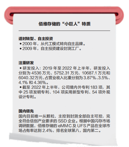 在专利方面,截至2022年上半年,佰维存储共取得境内外专利183项,其中25项发明专利、104项实用新型专利、54项外观设计专利,范围涵盖公司研发及生产过程中的各个关键环节。在技术实力和市场地位不断提升的基础上,佰维存储已经成为国内半导体存储器行业中首批入选专精特新“小巨人”的企业。