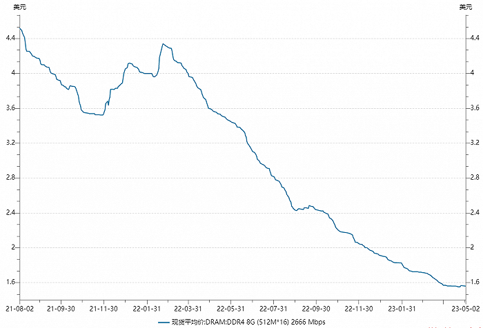 从2022年开始,存储价格开启了一波迅猛下跌。以DRAM(DDR4 8G)为例,现货价格从2002年初的4美元一路跌至2023年5月的1.6美元。