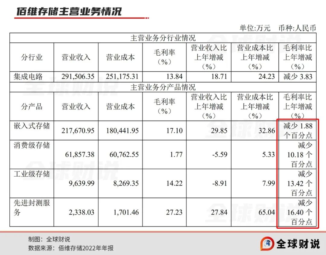 2022年,佰维存储的毛利率进一步下降至13.84%。其中,消费级存储毛利率减少10.18个百分点至1.77%,工业级存储、先进封测服务的毛利率则分别减少13.42个百分点、16.40个百分点。虽然上述上个月收入占比并不如嵌入式存储占比高,但是仍对上市公司毛利率产生不小影响。