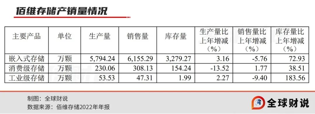 不过,根据2022年财报来看,佰维存储嵌入式存储库存量同比增长72.93%至3279.27万颗;消费级存储库存量同比增长38.51%至154.24万颗;工业级存储库存量同比增长183.56%至1.99万颗。同时,2022年佰维存储存货账面价值为19.54亿元,占流动资产比例高达55.46%,存货跌价准备为1.27亿元。