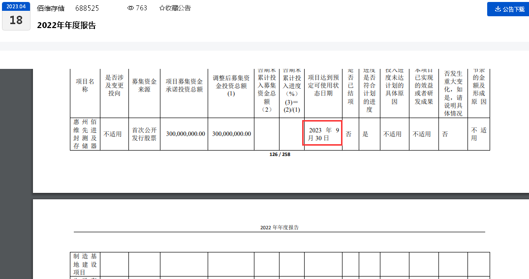 根据佰维存储2022年年度报告,“惠州佰维先进封测及存储器制造基地建设项目”预计在今年即2023年9月30日达到预定可使用状态。