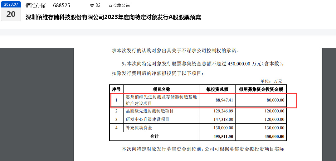 而近日,即7月20日,佰维存储披露定增预案,称将募投45.00亿元,其中拟用8.00亿元募投资金用于“惠州佰维先进封测及存储器制造基地扩产建设项目”。