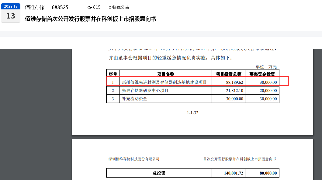 公开资料显示,在申请IPO首发时,佰维存储称将3亿元募投资金用于“惠州佰维先进封测及存储器制造基地建设项目”,该项目总投资约为8.82亿元。