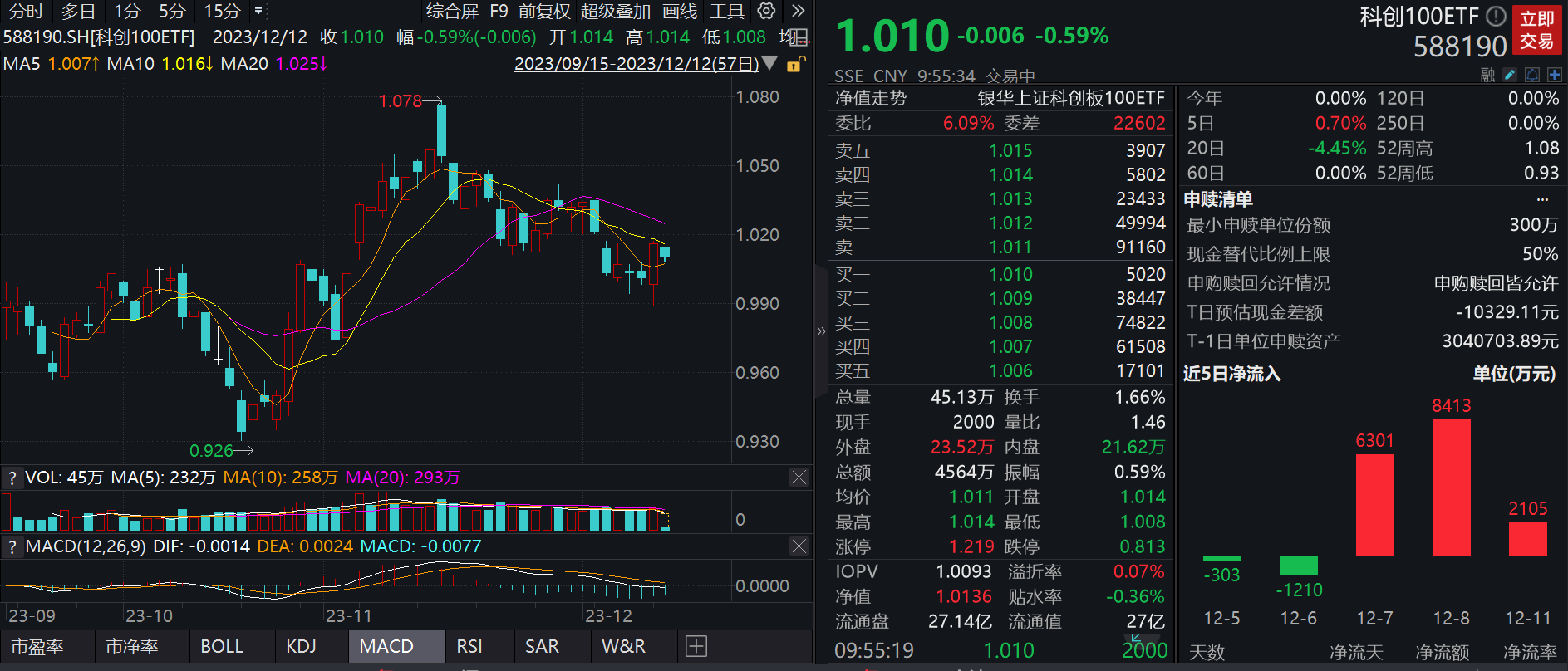 截至2023年12月12日9:55,科创100ETF(588190)盘中震荡回调0.59%,成交额达4564万元,成交额持续扩大,市场交投活跃。Wind数据显示,该基金已连续3日获资金净流入,备受资金关注。