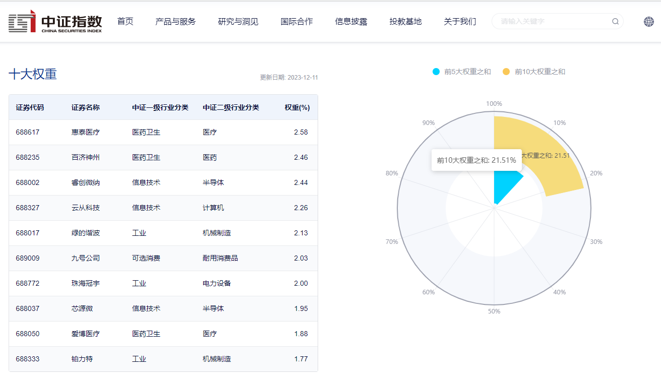 数据显示,截至2023年12月11日,该指数前十大权重股包括惠泰医疗、百济神州、睿创微纳、云从科技、绿的谐波等,前十大权重股合计占比约为21.51%。(数据来源:中证指数公司,指数成份股不代表个股推荐)
