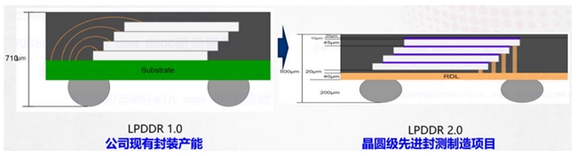 通过制作RDL重布线层替代基板,可以把LPDDR的厚度从原来的710μm降低到500μm,从而满足智能手机轻薄化的需求。