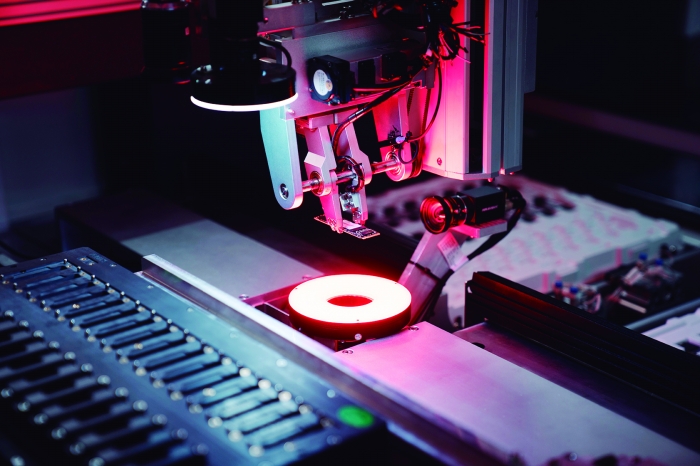 随后,承载晶圆的机器人沿着黄色安全线轨道行进,自动对接固晶设备,由微型机械臂以毫米级精度完成晶粒抓取和堆叠操作。