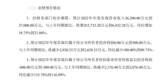 1月13日盘后,秦川物联(688528.SH)发布全年业绩预告,公司预计2022年预计营业收入为3.63亿至3.70亿元,同比增加18.75%到21.04%;归属于上市公司股东的净利润为0-300万,净利润同比下降100%至89.73%。预计2022年年度实现归属于母公司所有者的扣除非经常性损益后的净利润-600万元到-300万元,与上年同期相比,将减少2376.4万元到2076.4万元,同比减少133.78%到116.89%。