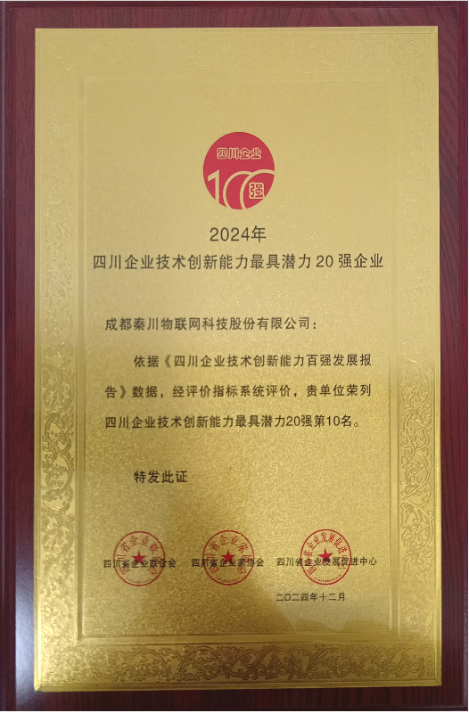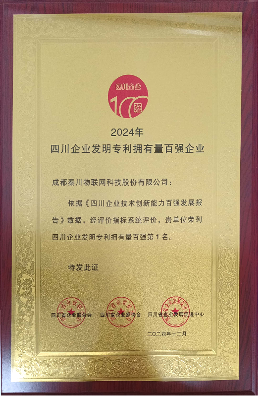 企业创新是推动技术进步的重要力量。近日,在2024年四川企业技术创新发展大会上,四川省企业联合会推出《2024四川企业技术创新能力百强发展报告》,成都秦川物联网科技股份有限公司(以下简称秦川物联网)获评为“2024年四川企业技术创新能力百强企业”、“2024年四川企业发明专利拥有量百强企业”、“2024年四川企业技术创新能力最具潜力20强企业”。