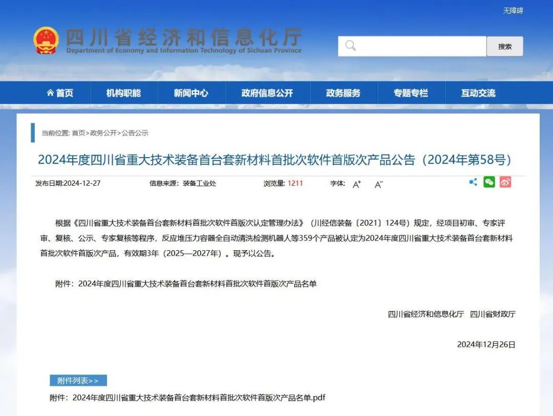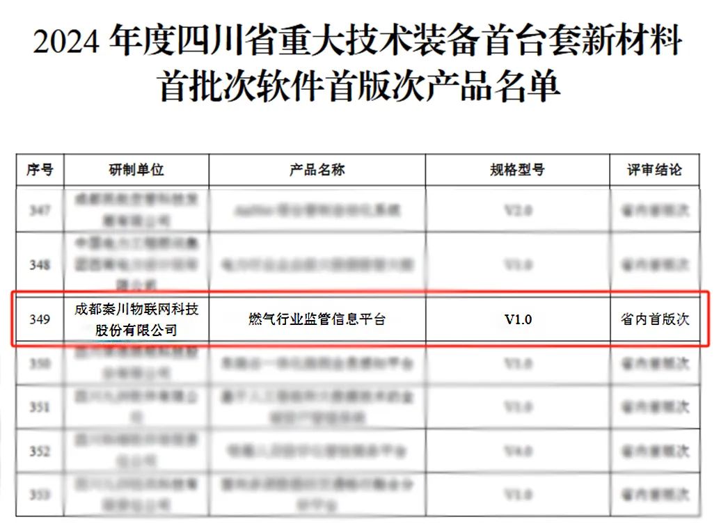 近日,四川省经济和信息化厅根据《四川省重大技术装备首台套新材料首批次软件首版次认定管理办法》(川经信装备〔2021〕124号)规定,经项目初审、专家评审、复核、公示、专家复核等程序,秦川物联燃气行业监管信息平台被认定为2024年度四川省重大技术装备首台套新材料首批次软件首版次产品,有效期3年(2025-2027年)。