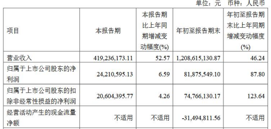 第三季度,公司营业收入4.19亿元,同比增长52.57 %;归属于上市公司股东的净利润2421.06万元,同比增长6.59%;归属于上市公司股东的扣除非经常性损益的净利润2060.44万元,同比增长4.26%。