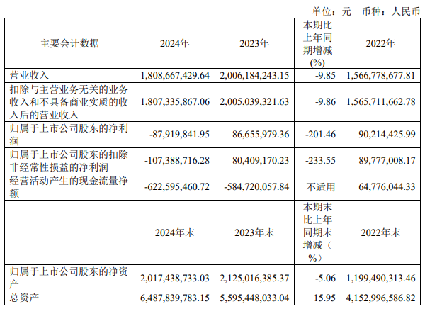 2024年,公司实现营业收入18.09亿元,同比下降9.85%;归属于上市公司股东的净利润-8791.98万元,上年同期为8665.60万元;归属于上市公司股东的扣除非经常性损益的净利润-1.07亿元,上年同期为8040.92万元;经营活动产生的现金流量净额-6.23亿元,上年同期为-5.85亿元。