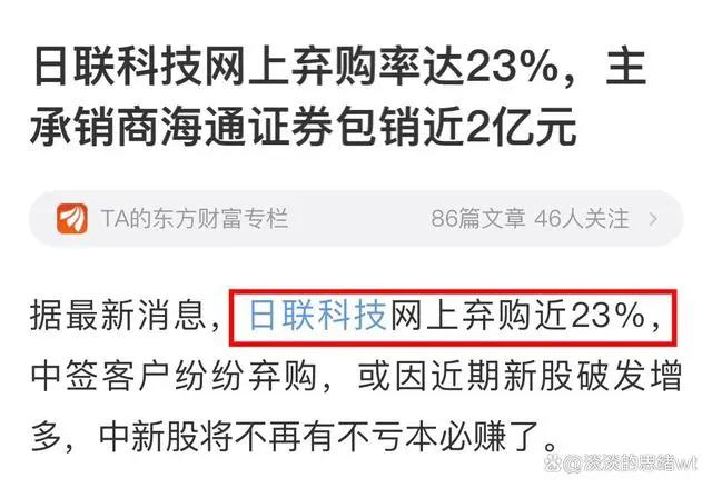 日联科技承销商海通证券,弃购23%的股票价值1.99亿,全部由它包揽了,今天海通证券回收弃购的股票就盈利1.1亿左右,当然没有这么多弃购,也不可能高开57%,让你轻轻松松赚4.45万。