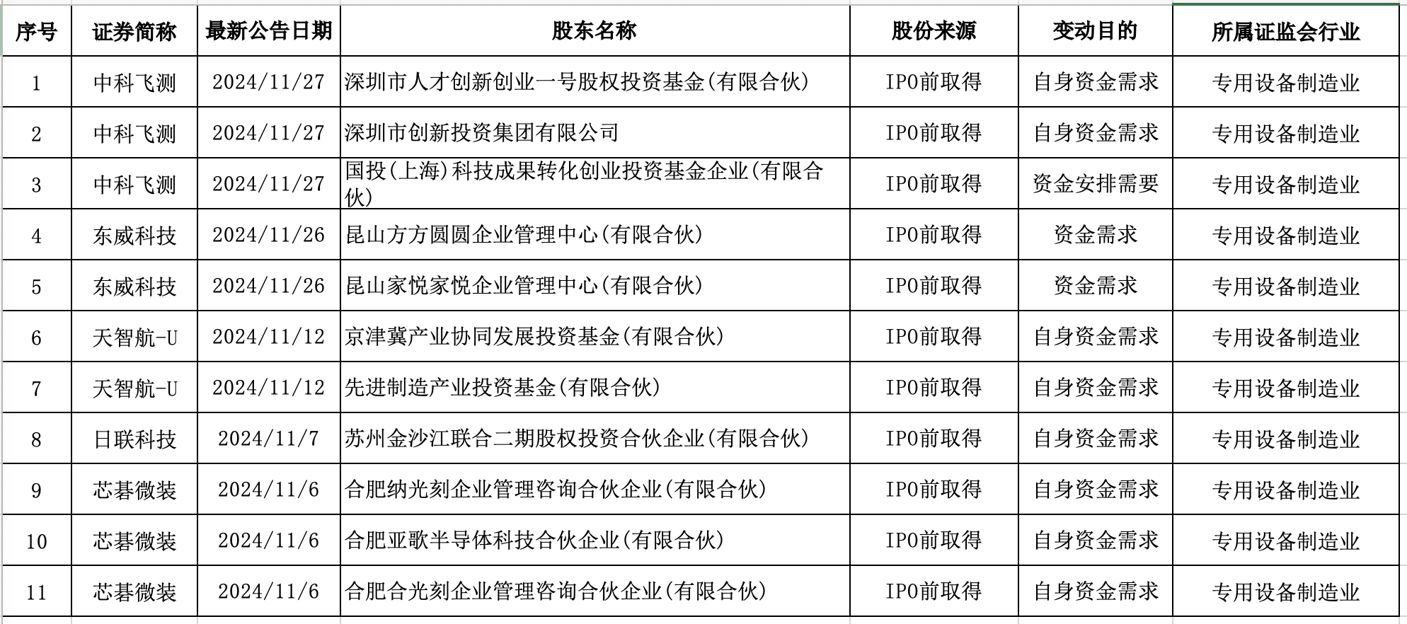 根据金融终端数据显示,2024年11月共有5家科创板专用设备制造业上市公司发布了IPO前取得股份的股东减持公告,减持目的主要为自身资金需求。
