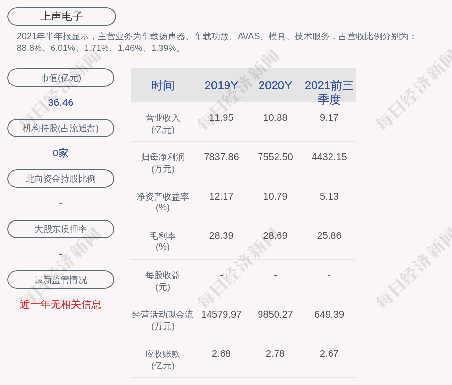 2021年半年报显示,上声电子的主营业务为车载扬声器、车载功放、AVAS、模具、技术服务,占营收比例分别为:88.8%、6.01%、1.71%、1.46%、1.39%。