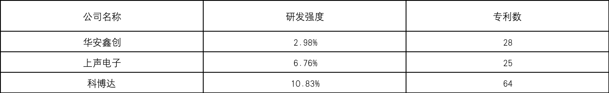 2021年华安鑫创、上声电子、科博达研发人员持有的专利件数分别为28件、25件、64件,而上述三家企业2021年的研发投入分别为2157.77万元、8795.67万元、30400万元。由以上数据可看出,上声电子2021年研发投入高于华安鑫创,但持有的专利数却少于华安鑫创,说明上声电子研发效率有待提高。