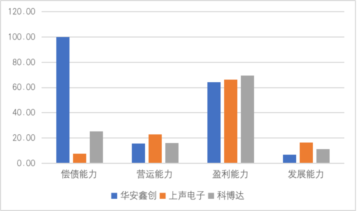 2021年,智能座舱赛道企业各项财务指标评分如图4。偿债能力方面,华安鑫创、上声电子、科博达评分分别为100分、7.48分、25.47分,上声电子评分大幅低于同赛道另两家企业。公司偿债能力低的主要原因是流动资产的减少及流动负债的大幅增加。流动资产上,2021年公司货币资金较上年末下降19.31%,主要系:(1)公司主要原材料采购价格普遍上涨,且受国际疫情反复的影响出口运输费用增加;(2)公司为满足经营业务发展的需求进一步扩大销售、研发、管理团队,导致工资薪金增加;(3)随着汽车市场的蓬勃发展,公司加大研发投入;(4)公司为满足生产需求,加大固定资产投入,扩充捷克、墨西哥等海外工厂生产线。流动负债上,2021年其他应付款较上年末上涨31.53%,主要系公司生产线新建和改造升级增加的应付设备款。其他流动负债较上年末增加206万元,主要系巴西上声收到的客户空运费补偿,其中预收流转税206万元。在营运能力方面,华安鑫创、上声电子、科博达评分分别为15.50分、22.92分、16.01分。在发展能力方面,华安鑫创、上声电子、科博达评分分别为6.87分、16.31分、11.15分。由上述数据可看出,上声电子的营运能力及发展能力都位于赛道首位,公司资产周转及资产增长情况较好。在盈利能力方面,华安鑫创、上声电子、科博达评分分别为64.11分、66.33分、69.54分。三家公司盈利能力相差不大,上声电子在其中排名第二,盈利能力仍需加强。