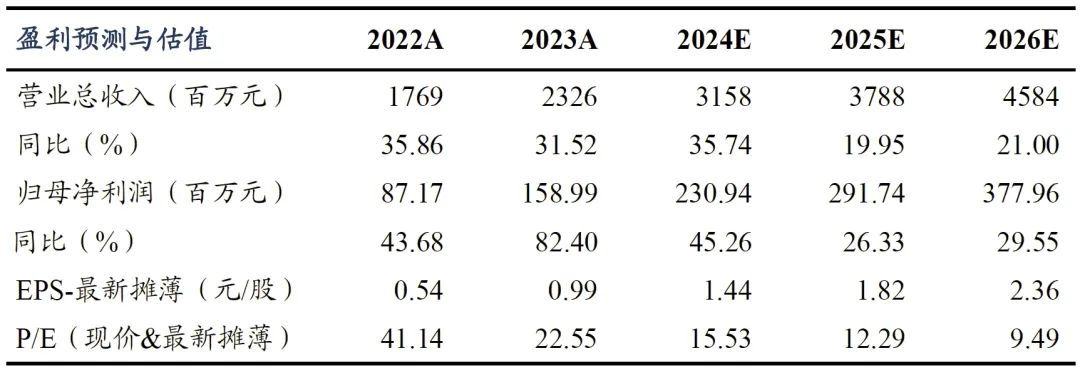 我们维持公司2024~2026年营业收入预测为31.6 /37.9/45.8亿元,分别同比+36%/+20%/+21%,维持2024~2026年归母净利润为2.3/2.9/3.8亿元,分别同比+45%/+26%/+30%,对应PE为16/12/9倍,维持“买入”评级。