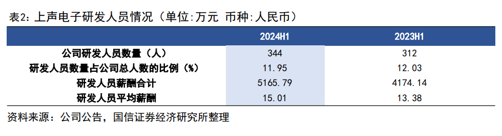 2024 年上半年,公司持续加大研发方面的投入,不断巩固在车载扬声器方面的既有优势,同时着力研发成长中的汽车电子和声学应用软件,在科技项目、专利申报工作方面持续进步。2024H1,公司共有研发人员344人,公司共申请专利18项,其中申请实用新型专利5项、pct 专利3项、发明专利 5 项,外观设计5项。