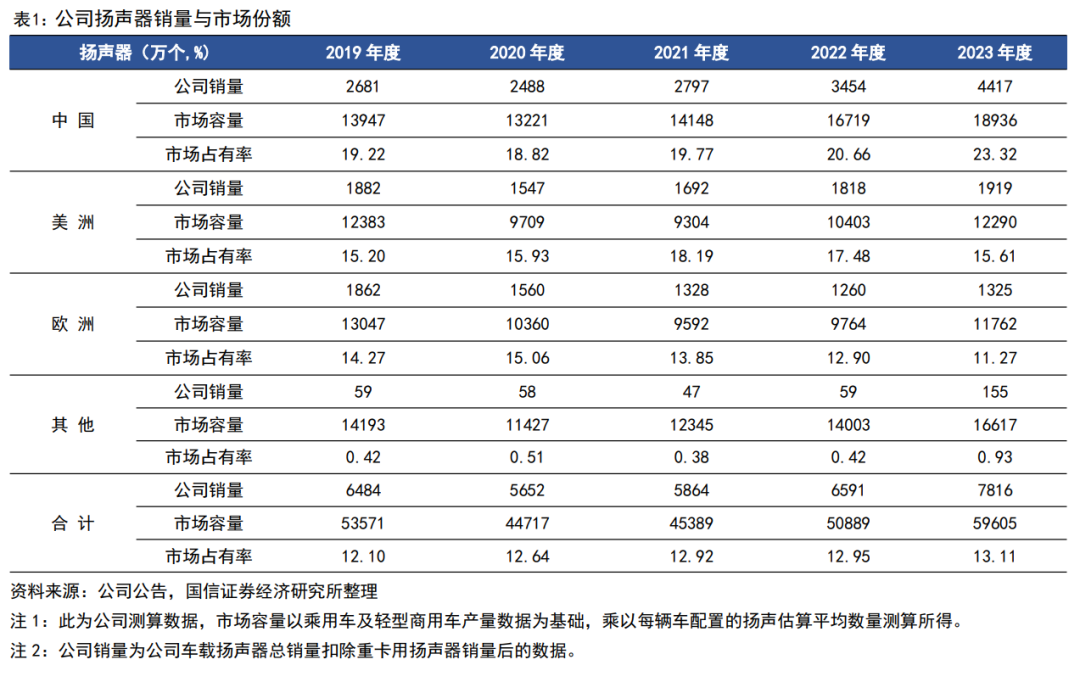 公司专注于车载声学三十余年,2023年扬声器全球份额提升至13.11%。
