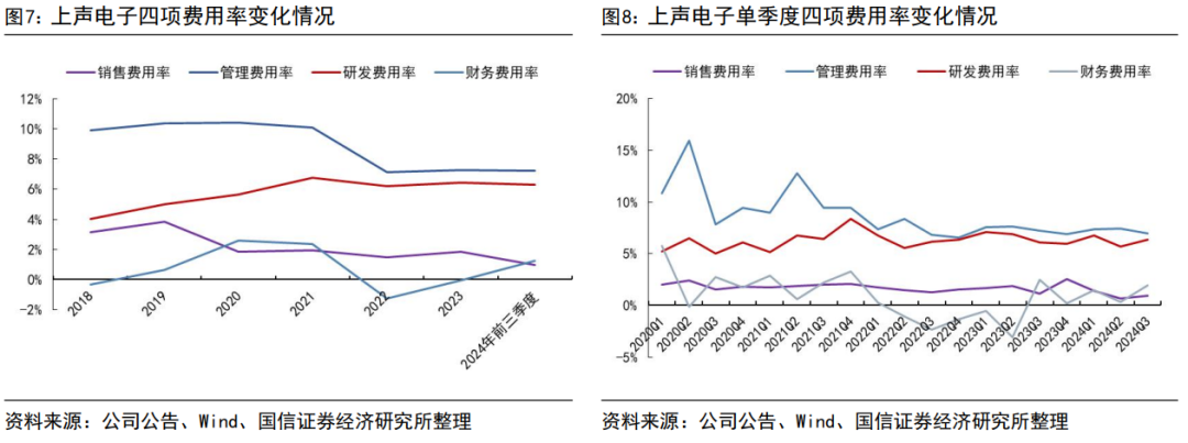 2024Q3上声电子实现归母净利润0.78亿元,同比增长117%。公司2024年前三季度实现营业收入19.94亿元,同比增长25.2%,归母净利润1.90亿元,同比增长76.86%。拆单季度看,2024Q3实现营收7.56亿元,同比增长20.09%,环比增长17.98%,实现归母净利润0.78亿元,同比增长116.88%,环比增长47.11%。整体来看,公司2024年前三季度归母净利润同比增长77%,原因主要系:1)汽车市场发展及公司产品综合竞争实力的提升,收入增长明显;2)原材料价格稳定,产品综合毛利提升。