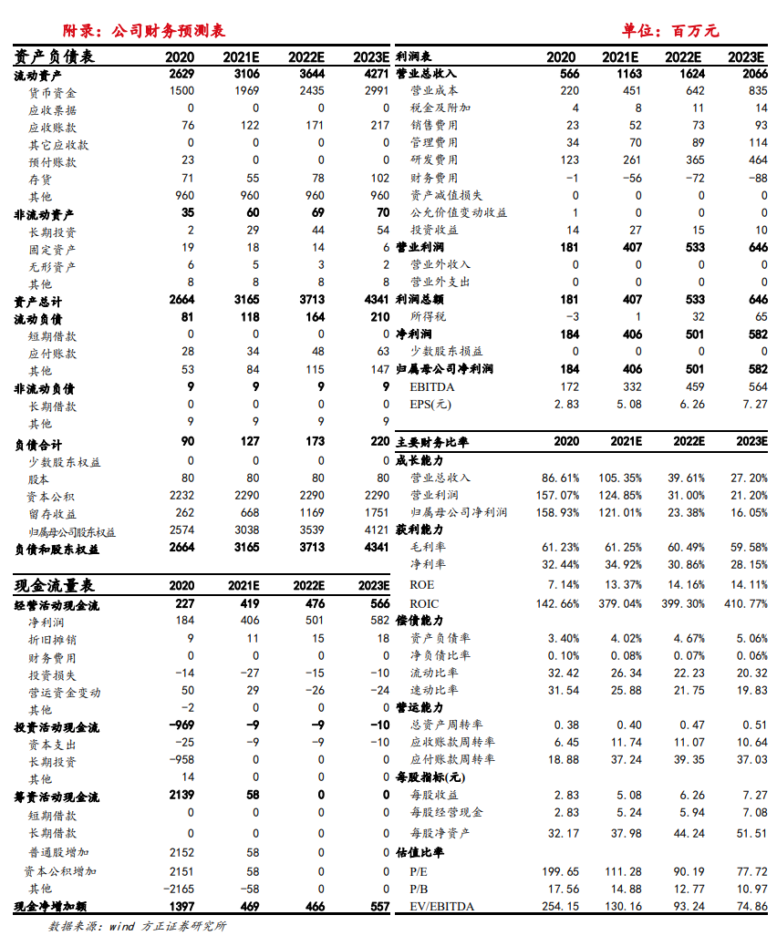 盈利预测:我们预计2021-2023年,公司营业收入将达到11.63/16.24/20.66 亿元,归母净利润4.06/5.01/5.82亿元,给予“推荐”评级。