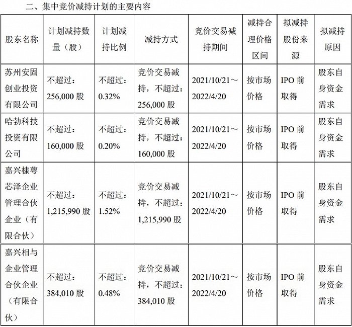 从减持计划来看,持股5.31%的苏州安固创业投资有限公司(下称“安固创投”)最高减持0.32%;持股6.00%的哈勃科技最高减持0.2%;嘉兴棣萼芯泽企业管理合伙企业(下称“棣萼芯泽”)及其一致行动人嘉兴相与企业管理合伙企业(下称“嘉兴相与”)最高减持2%。