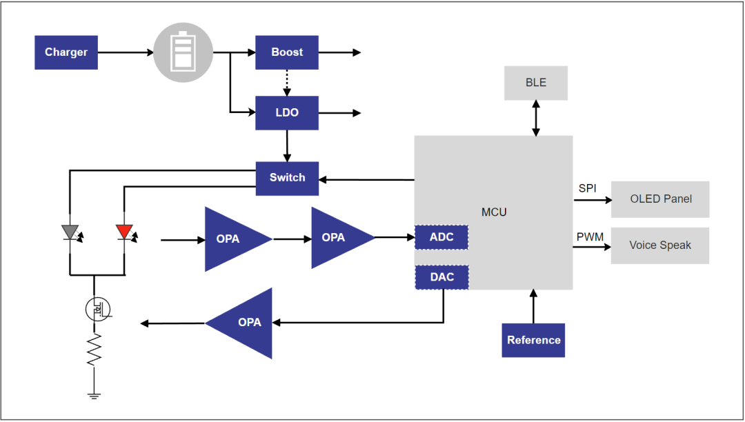 血氧仪的分立方案中一般会有运算放大器的需求,用于传感器小信号放大、光电转换或者降噪滤波等。
