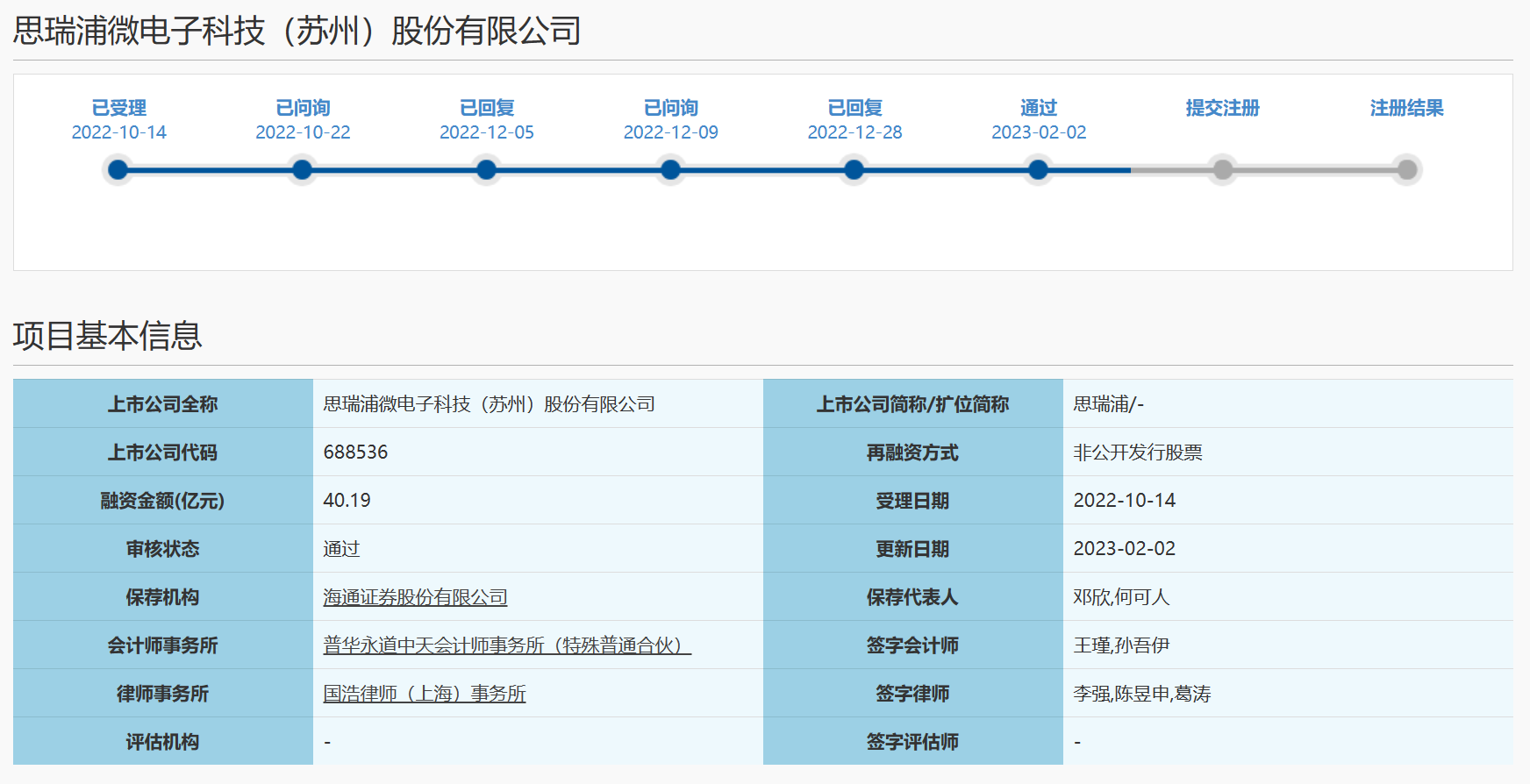 2月2日,思瑞浦微电子科技(苏州)股份有限公司(以下简称“思瑞浦”)拟“向特定对象发行A股股票募集”申请获上海证券交易所审核通过。