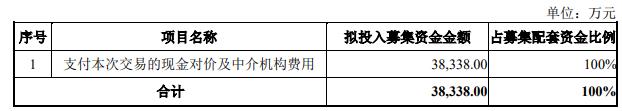 本次交易中,上市公司拟募集资金金额不超过38,338.00万元。本次募集资金总额不超过本次交易拟购买资产交易价格的100%。本次募集配套资金拟用于支付本次交易的现金对价及中介机构费用。