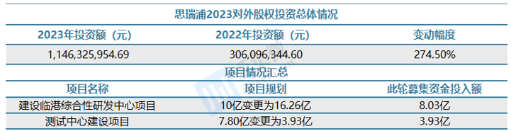 根据报告期内对外股权总体分析,2023年公司对外投资额增幅达274.5%至11.46亿元,募集资金去向主要集中在“临港综合性研发中心建设项目”“测试中心建设项目”实施主体进行增资所致。