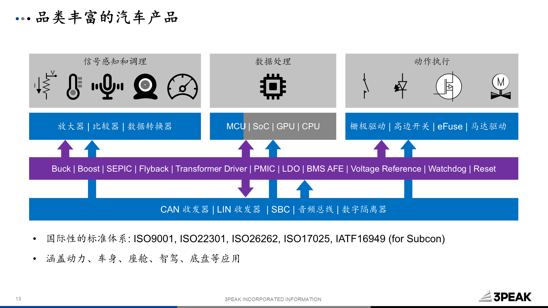 作为国内模拟芯片的领行者,思瑞浦除了在车载摄像头电源管理领域提供了丰富的选型外,更致力于全方位的汽车芯片创新研发,现已拥有20+产品品类、160+款车规级芯片,涵盖放大器、比较器、模拟开关、CAN收发器、LIN收发器、数字隔离器、数据转换器、LDO、电源监控、DCDC、栅极驱动、马达驱动、功率开关、PMIC等。通过这些产品,思瑞浦为汽车制造商提供了灵活且全面的解决方案,不仅满足了汽车电子系统的严苛要求,也为未来的智能汽车技术奠定了坚实基础。