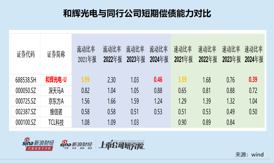 数据显示,和辉光电短期偿债能力指标大幅下滑,2021-2024年的流动比率分别为3.99、2.3、1.03、0.46,速动比率分别为3.59、1.68、0.76、0.39 。