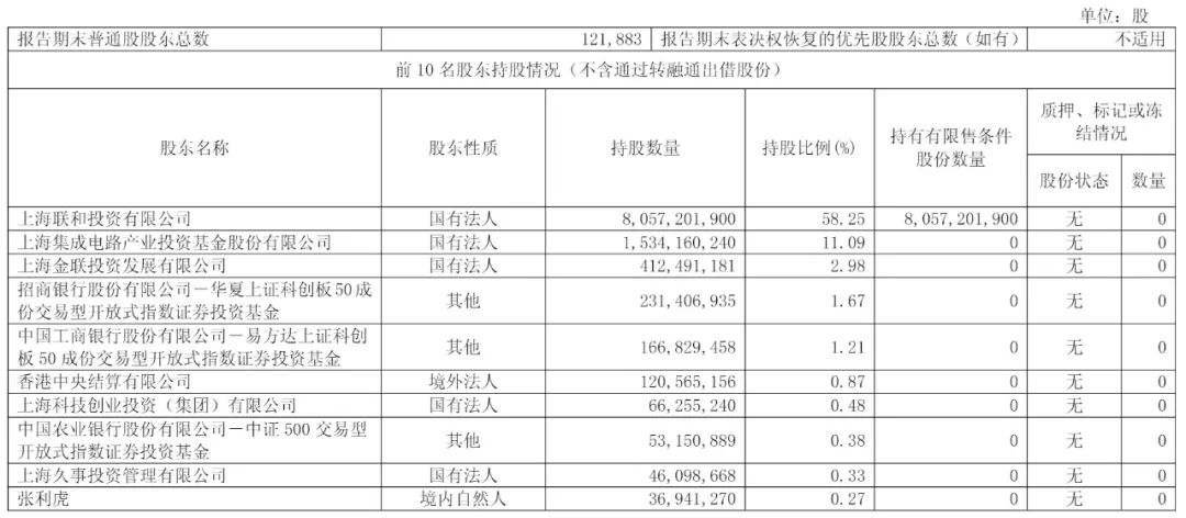 截至2025年3月31日,上海联和持股为58.25%,集成电路基金公司持股为11.09%,上海金联持股为2.98%。