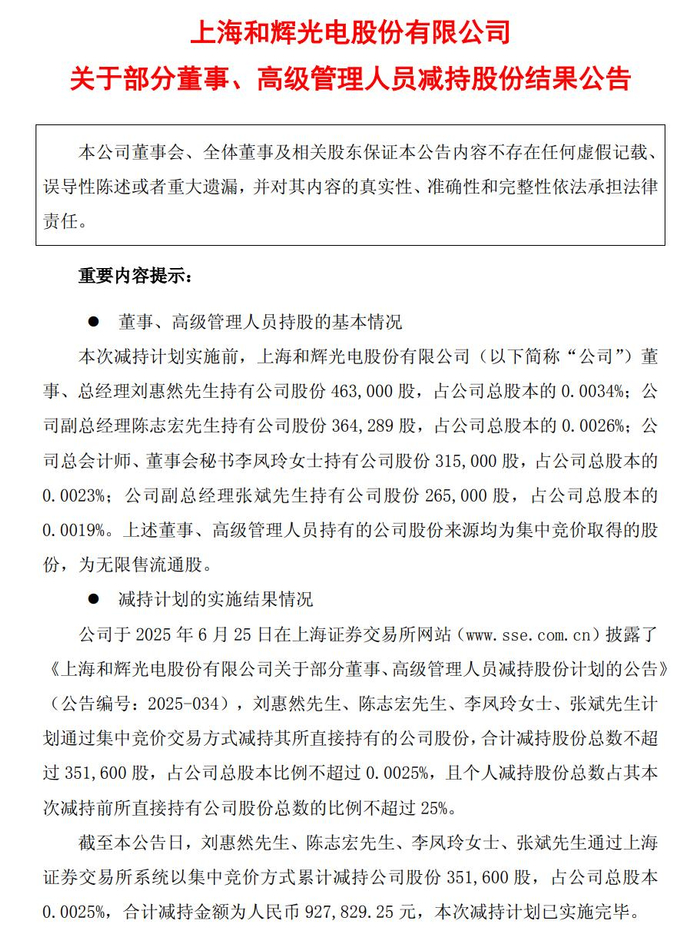 2025年8月29日,和辉光电披露减持股份结果公告,称相关股东累计减持该公司0.0025%的股份,减持计划实施完毕,合计92.78万元。其中,刘惠然为和辉光电董事、总经理,张斌、陈志宏为副总经理,李凤玲为总会计师、公司董事会秘书。
