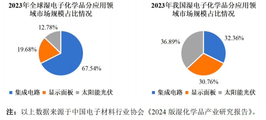 从全球市场看,2023年,湿电子化学品应用于集成电路行业的市场规模占市场总规模的67.5%,国内市场这一占比为32.4%,相对较低。