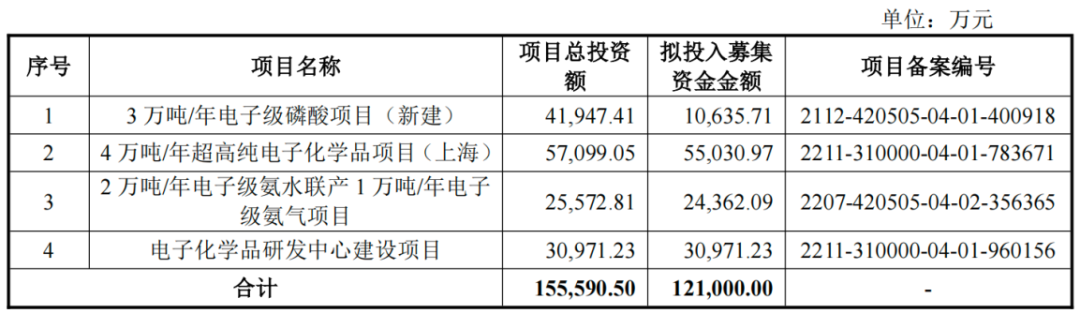 公司拟募资12.1亿元,将用来投资于3万吨/年电子级磷酸项目(新建)、4万吨/年超高纯电子化学品项目(上海)、2万吨/年电子级氨水联产1万吨/年电子级氨气项目和电子化学品研发中心建设项目。