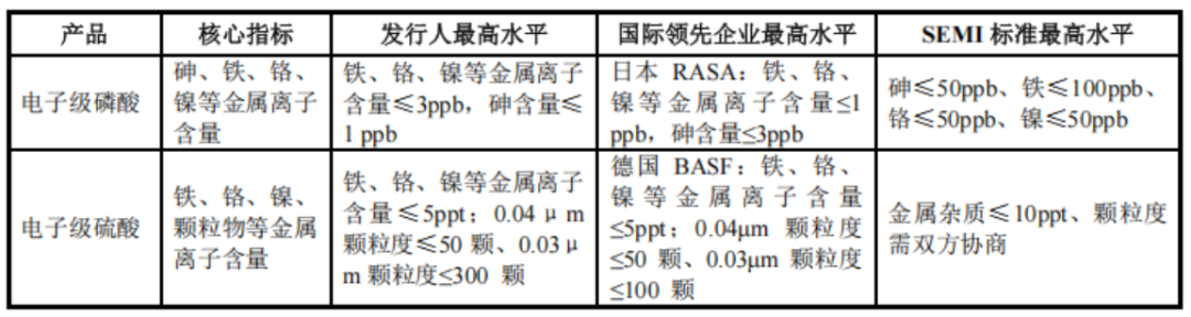 如单纯对比行业标准,公司电子级磷酸、电子级硫酸产品可实现的核心技术指标显然是优于行业最高等级标准,和国际领先企业也能掰一掰手腕。