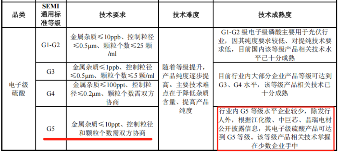电子级硫酸适用SEMI通用标准,公司电子级硫酸已达到该标准下最高等级G5等级,该等级的相关技术也是掌握在少数企业手中。