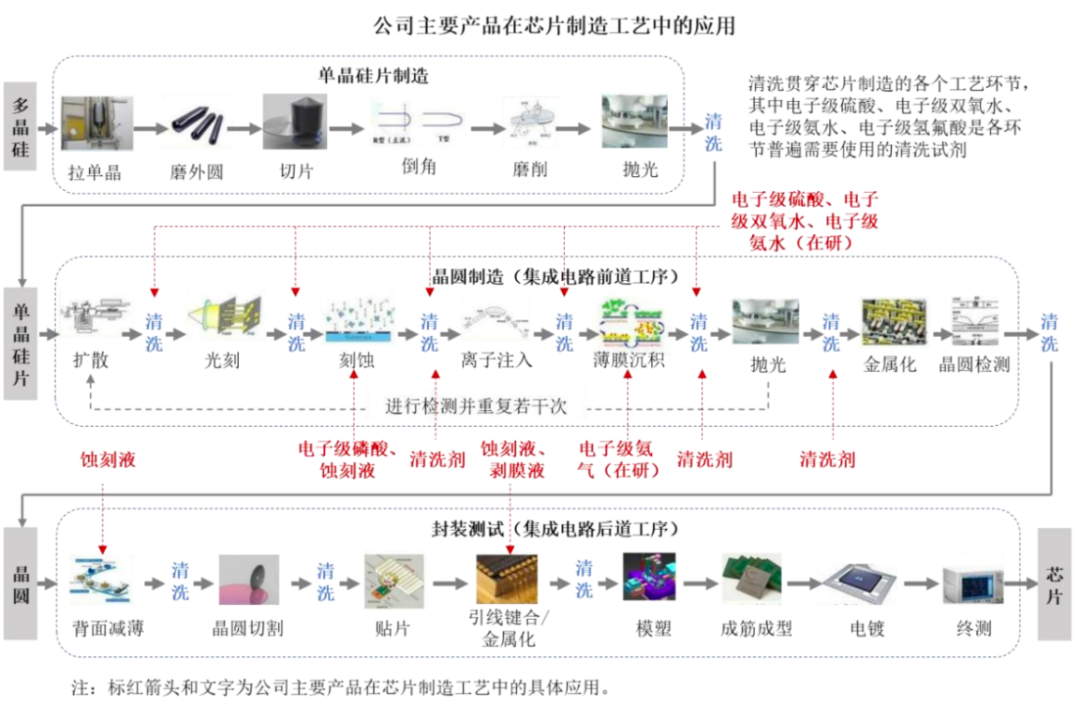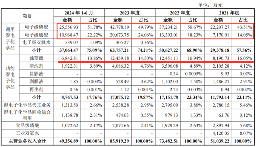 公司主要产品涵盖电子级磷酸、电子级硫酸、电子级双氧水等通用湿电子化学品以及蚀刻液、清洗剂、显影液、剥膜液、再生剂等功能湿电子化学品。