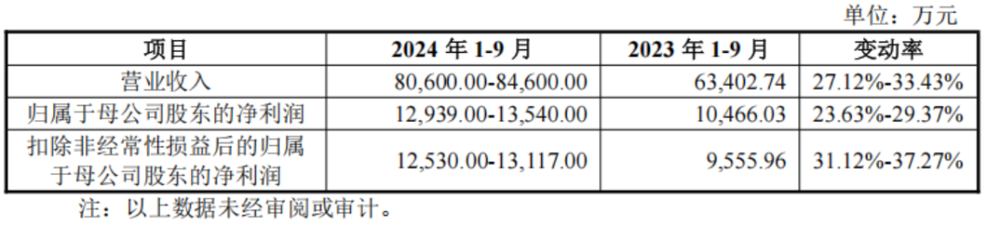 公司预计2024年1-9月营收在8亿-8.5亿之间,同比增长27%-33%,扣非净利润在1.3亿左右,同比增长31%-37%。