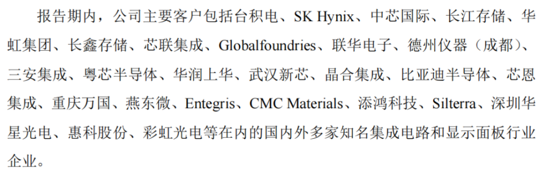 公司客户阵容堪称豪华,涵盖国内外多家知名半导体集成电路企业,如中芯国际、长江存储、华虹集团、台积电、SK海力士、格罗方德Globalfoundries等。