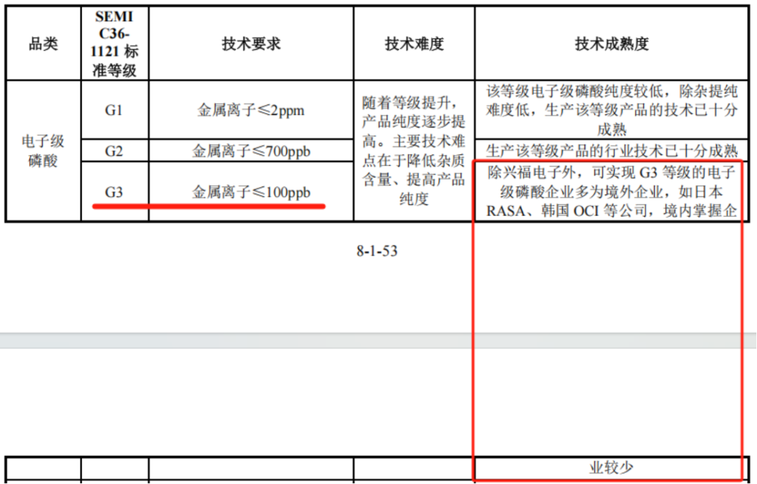 目前,行业内电子级磷酸适用SEMI C36-1121电子级磷酸标准,公司电子级磷酸已经达到最高标准G3等级。根据最新招股书,可实现G3等级的技术多为境外企业,境内企业较少。
