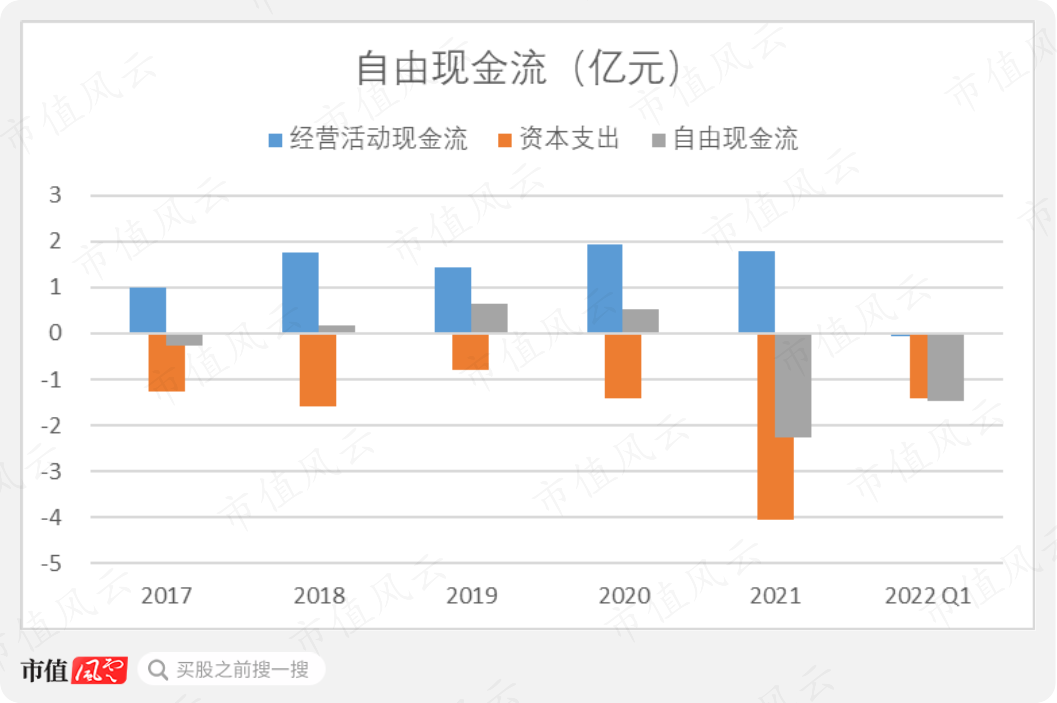 公司经营活动带来的现金流入较为稳定,不过由于募投项目的上马,公司2021年资本支出大增,自由现金流转负。2017~2021年,公司累计自由现金流为-1.5亿元。
