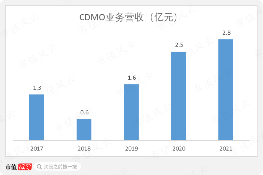 除了显示材料之外,公司另一大业务就是医药CMO/CDMO(合同定制生产外包机构)。近5年来的复合增速也达到了21.8%,2021年收入为2.8亿元。