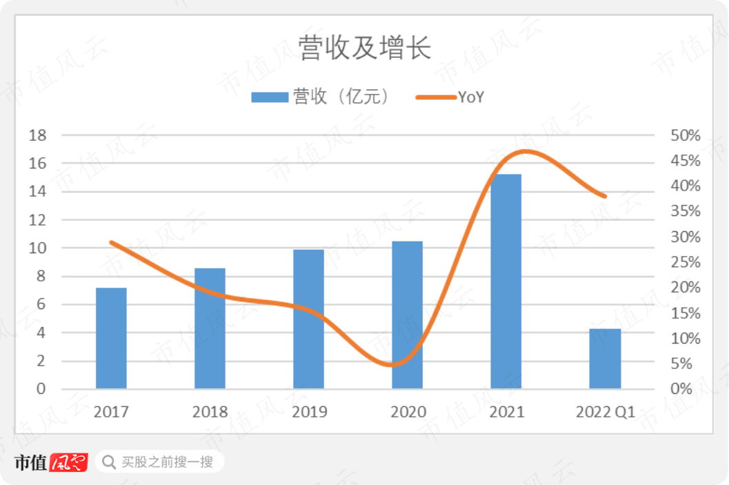 2022年第一季度,公司营收4.3亿元,同比增长38%。