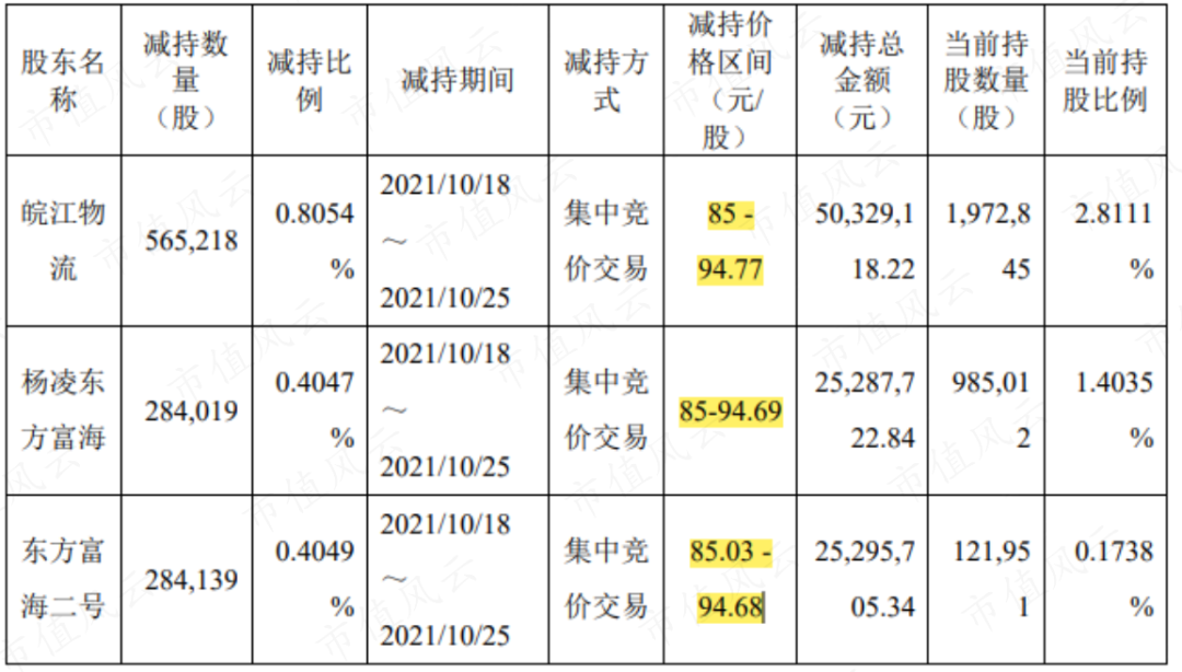 从10月26日发布的减持进展公告来看,这几位股东减持的价格区间最低是85元,而该股价只有9月10日和13日出现过,其余时间均未出现过85元以上的股价。