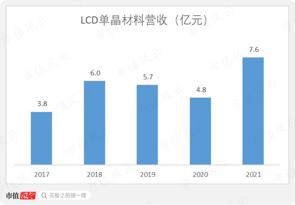 但液晶材料的营收在2018~2020年间一直在下滑,直到2021年才有一次巨幅提升,同比增速甚至达到了59%。